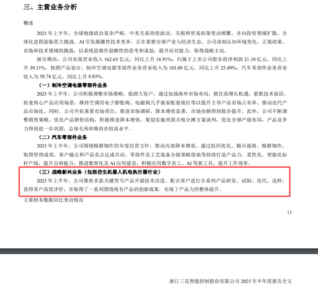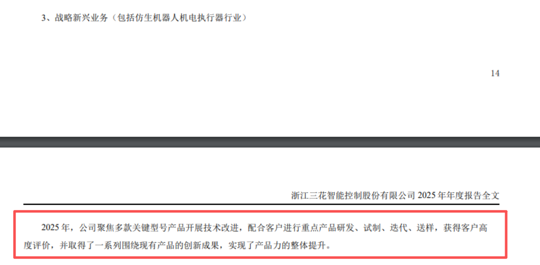 值得一提的是,对于市场关注的战略新兴业务(包括仿生机器人机电执行器行业),对比三花智控2025年半年度报告和2025年年度报告,公司的表述均为“聚焦多款关键型号产品开展技术改进,配合客户进行重点产品研发、试制、迭代、送样,获得客户高度评价,并取得了一系列围绕现有产品的创新成果,实现了产品力的整体提升。”