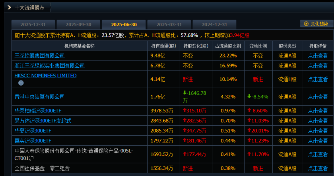 HKSCC NOMINEES LIMITED(港股通名义持有人)持续增持:与深股通相反,代表港股通持股的该账户期末持有4.77亿股,较年中增加了近6300万股,持股比例从10.14%提升至11.45%。这一增持动作表明,通过港股通渠道配置三花智控的南向资金或国际长线资金仍在积极布局。