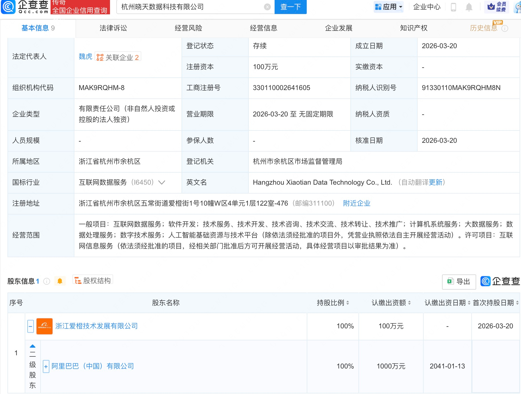 企查查APP显示,近日,杭州晓天数据科技有限公司、杭州衡宇数据科技有限公司成立,法定代表人均为魏虎,经营范围均包括互联网数据服务、软件开发、大数据服务、数据处理服务、人工智能基础资源与技术平台等。企查查股权穿透显示,二者皆由阿里巴巴(中国)有限公司旗下浙江爱橙技术发展有限公司全资持股。