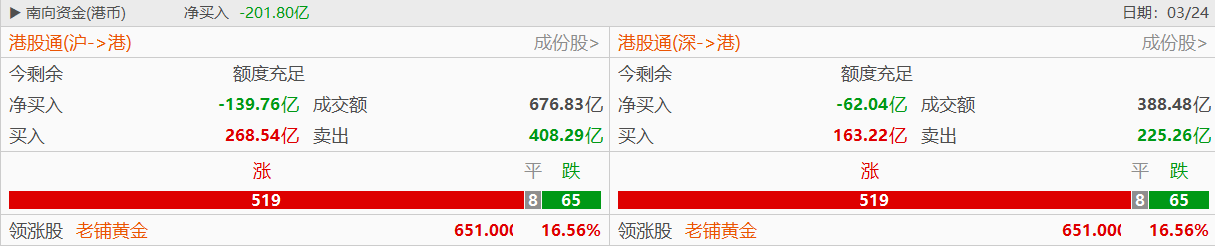 3月24日下午,截至发稿,南向资金净卖出额达200亿港元。