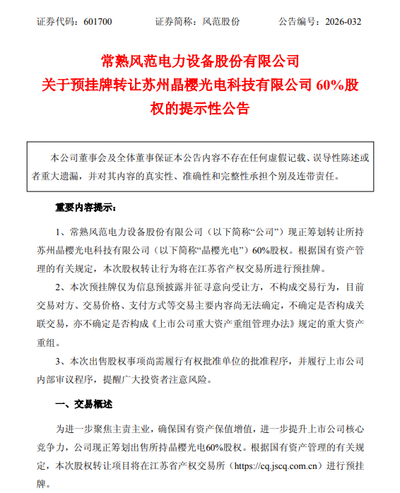 3月24日,风范股份(601700.SH)公告,公司筹划转让所持苏州晶樱光电科技有限公司(简称“晶樱光电”)60%股权,根据国有资产管理的有关规定,本次股权转让行为将在江苏省产权交易所进行预挂牌。