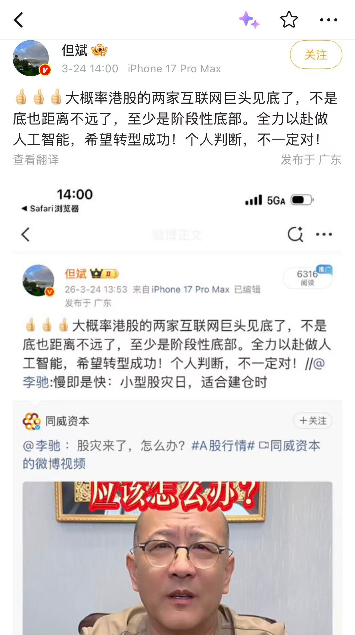 3月24日,私募大佬但斌在微博上发帖称,“大概率港股的两家互联网巨头见底了,不是底也距离不远了,至少是阶段性底部。全力以赴做人工智能,希望转型成功。个人判断,不一定对。”