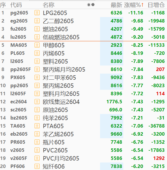 国内商品期货开盘多数下跌,液化气跌超11%,LU燃油跌超9%,燃料油跌超8%,塑料、聚丙烯、原油跌超7%,集运欧线跌超6%。