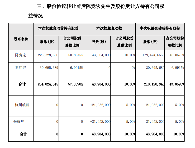 陈竞宏将其持有的公司无限售条件流通股2195.2万股股份(占公司股份总数的5%)以17.6元/股的价格转让给张耀坤,转让对价为人民币3.86亿元。