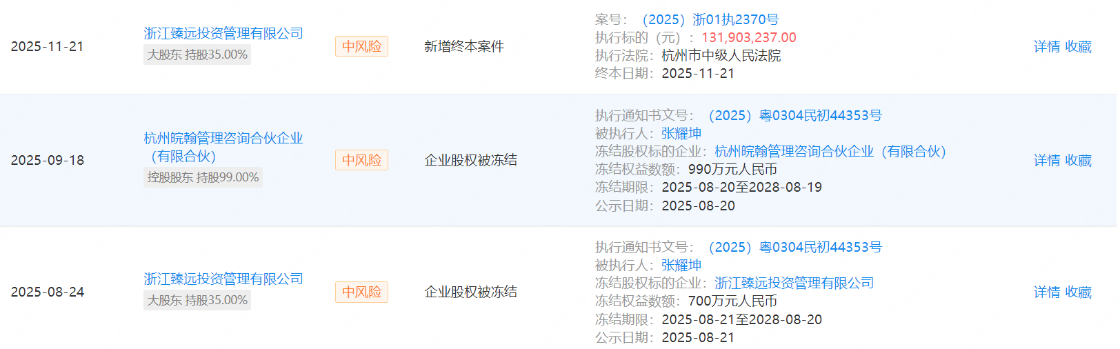 司法信息更是揭示了张耀坤所面临的困境。据企查查数据,2025年8月21日,张耀坤在浙江臻远的股权被冻结;2025年8月20日,其在杭州皖翰的股权也被冻结。2025年10月28日,浙江臻远被浙江省杭州市中级人民法院纳入被执行人名单,执行标的达1.31亿元;2026年3月13日,江苏省泰州市中级人民法院判处杭州皖翰为被执行人,执行标的高达7.67亿元。