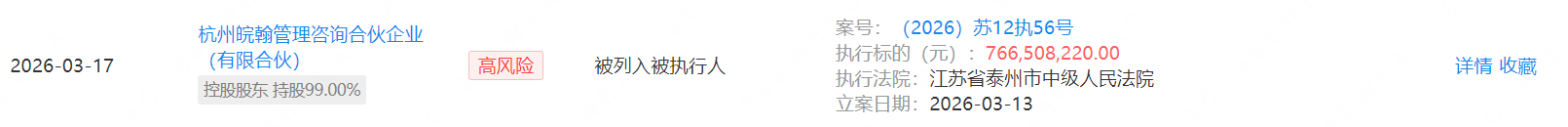 3月13日,江苏省泰州市中级人民法院的一纸判决,将杭州皖翰列为被执行人,执行标的高达76650.822万元。这一消息犹如一颗重磅炸弹,在市场引发强烈震动。