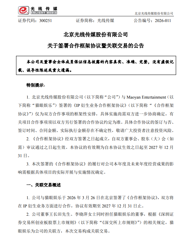 3月26日,光线传媒(300251.SZ)公告称,公司与关联方猫眼娱乐签署《IP衍生业务合作框架协议》,双方将在IP衍生品开发销售及现场娱乐业务活动等领域展开合作。协议有效期至2027年12月31日,具体合作以另行签署协议为准。