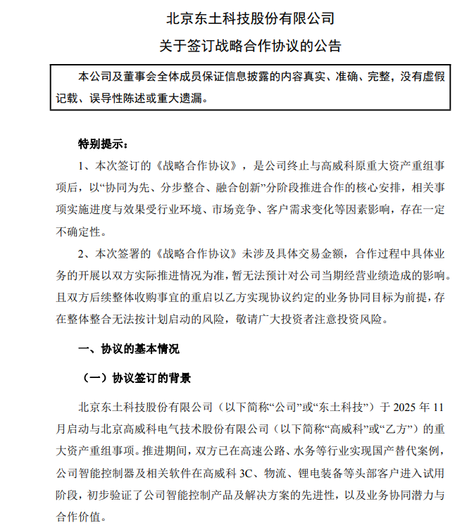 3月27日,东土科技(300353.SZ)公告称,公司原拟通过发行股份及支付现金方式购买北京高威科电气技术股份有限公司100%股份。重大资产重组事项推进期间,双方已在高速公路、水务等行业实现国产替代案例,公司智能控制器及相关软件在高威科 3C、物流、锂电装备等头部客户进入试用阶段。综合考量行业发展变化、协同成果落地周期、批量订单获取节奏等客观因素,经双方友好协商,决定终止原重大资产重组事项,并签署《战略合作协议》,根据双方协同进展重启整体收购。