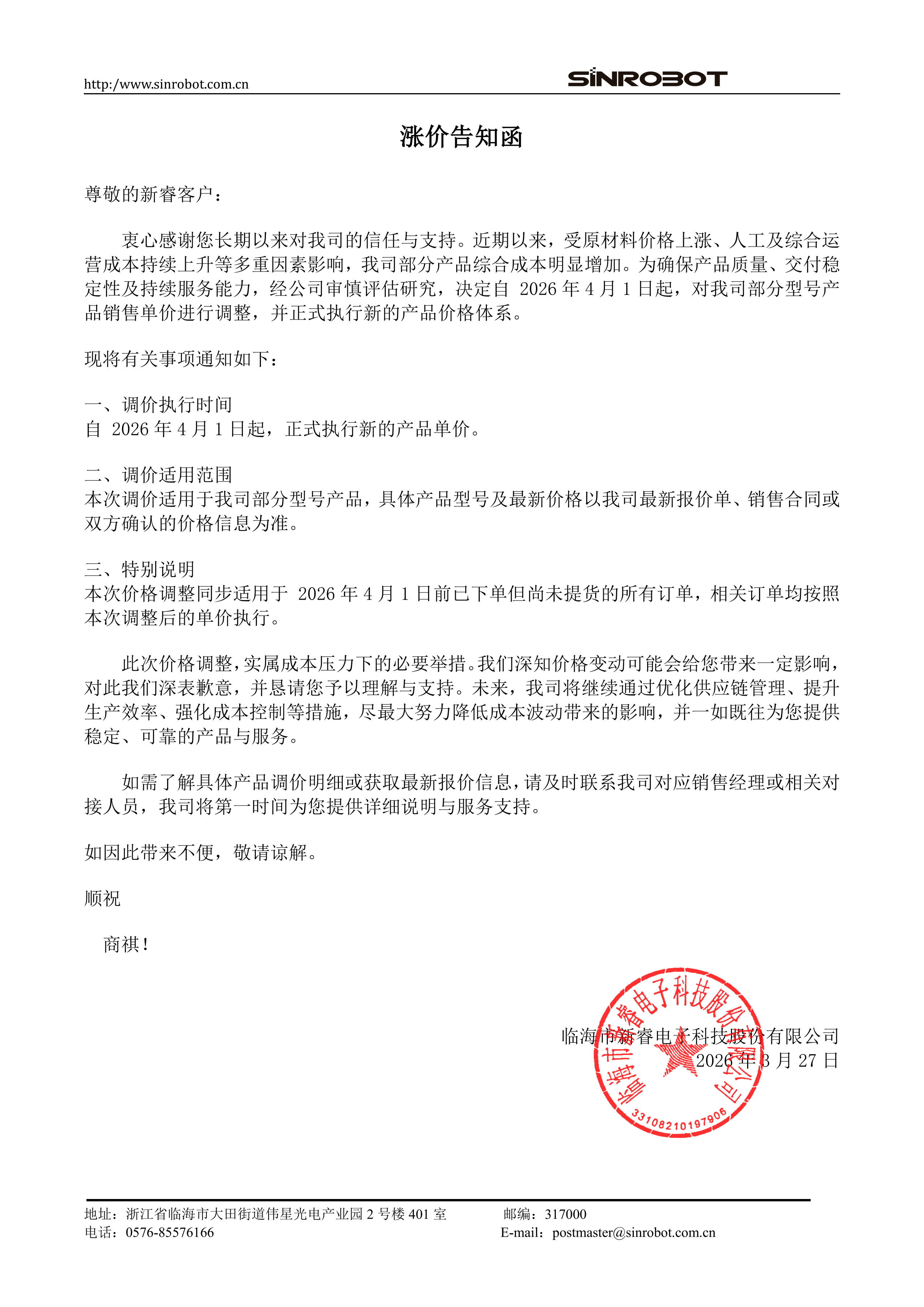 临海市新睿电子科技股份有限公司(简称“新睿电子”)3月27日发布涨价告知函称,受原材料价格上涨、人工及综合运营成本持续上升等多重因素影响,公司部分产品综合成本明显增加,经公司审慎评估研究,决定自2026年4月1日起,对公司部分型号产品销售单价进行调整,并正式执行新的产品价格体系。