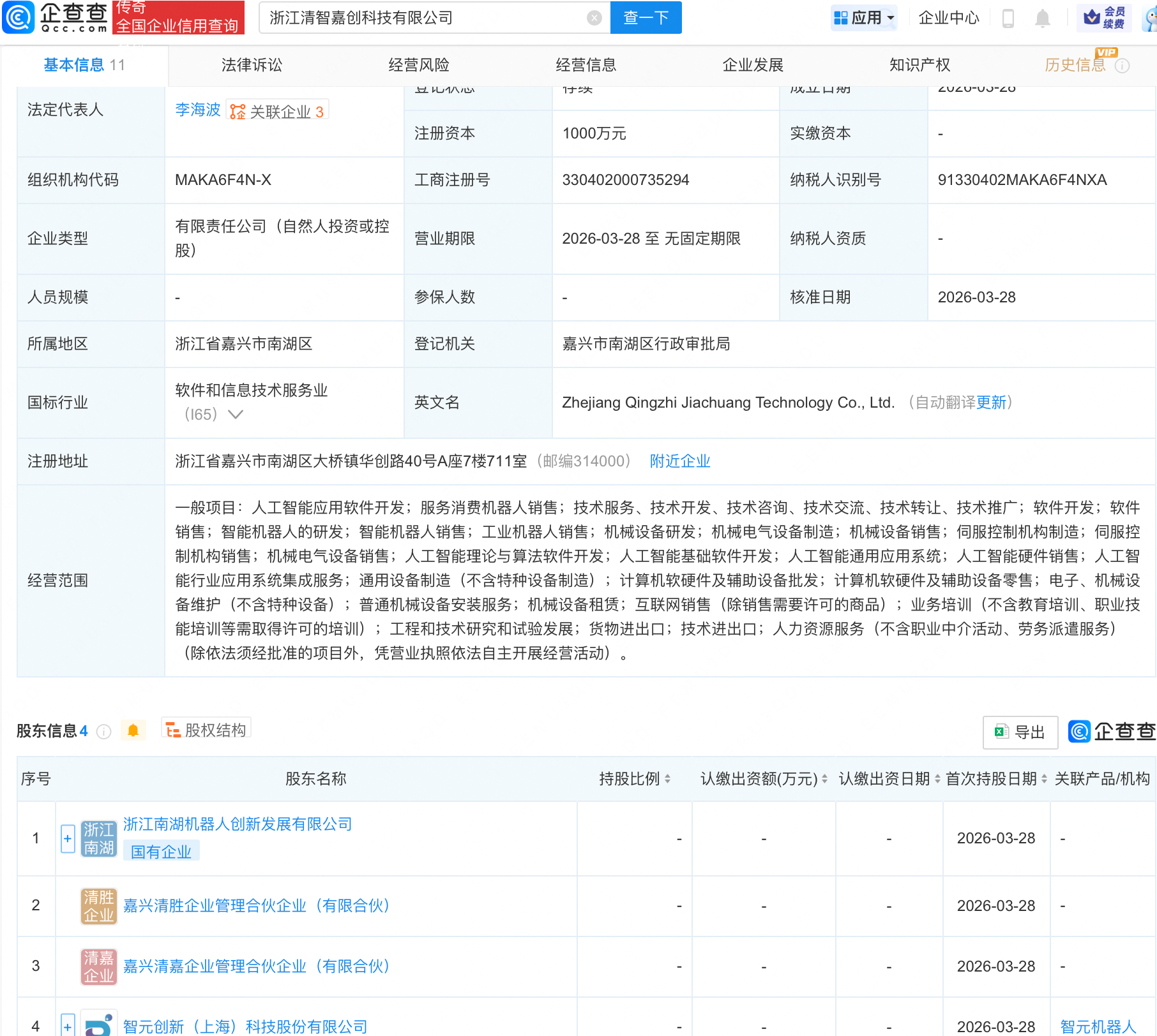企查查APP显示,近日,浙江清智嘉创科技有限公司成立,注册资本1000万元,经营范围包含:人工智能基础软件开发;人工智能通用应用系统;人工智能硬件销售;人工智能行业应用系统集成服务等。企查查股权穿透显示,该公司由浙江南湖机器人创新发展有限公司、智元机器人关联公司智元创新(上海)科技股份有限公司等共同持股。