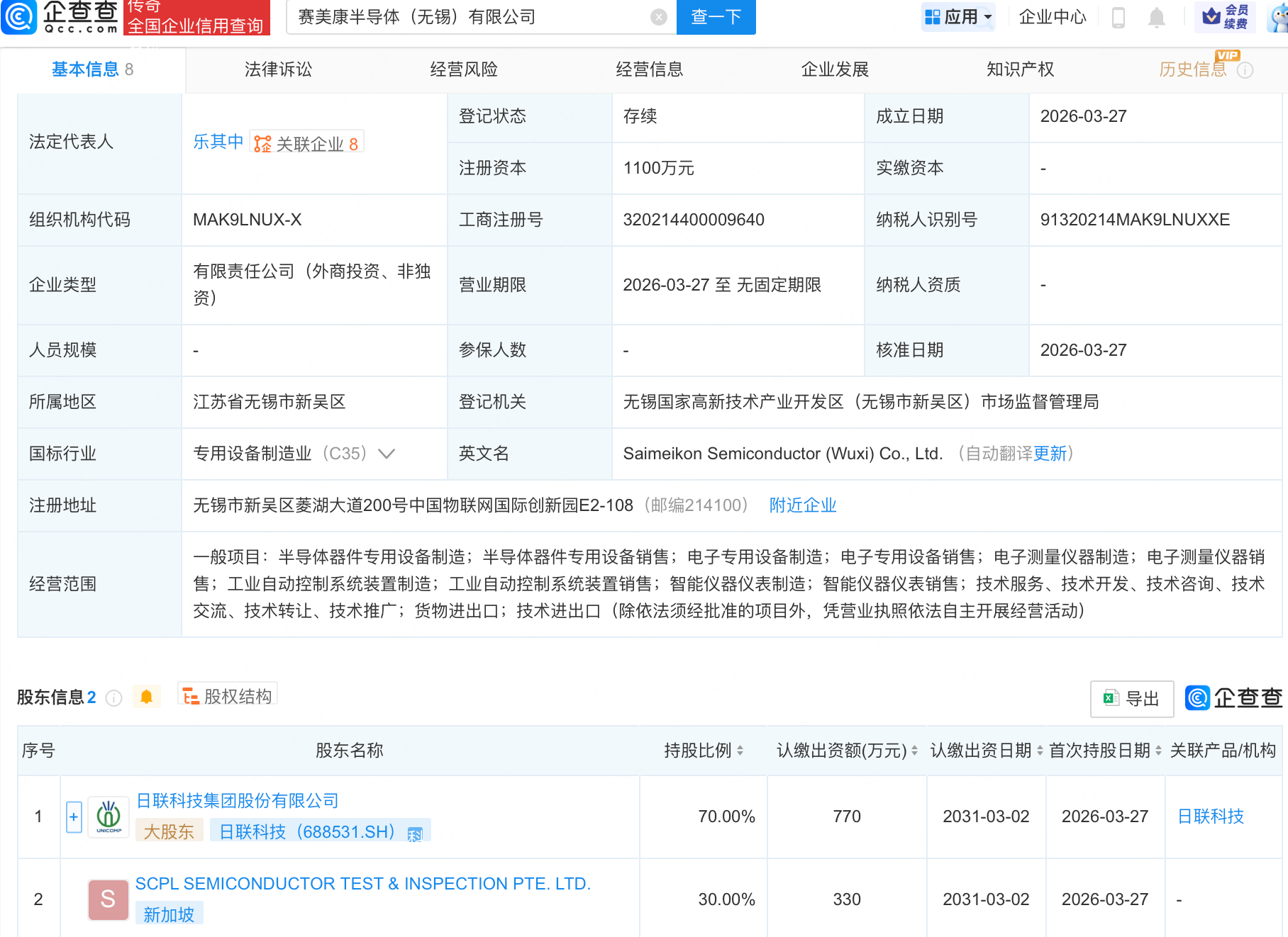 企查查APP显示,近日,赛美康半导体(无锡)有限公司成立,经营范围包含:半导体器件专用设备制造;半导体器件专用设备销售;电子专用设备制造;电子专用设备销售等。企查查股权穿透显示,该公司由日联科技(688531.SH)等共同持股。