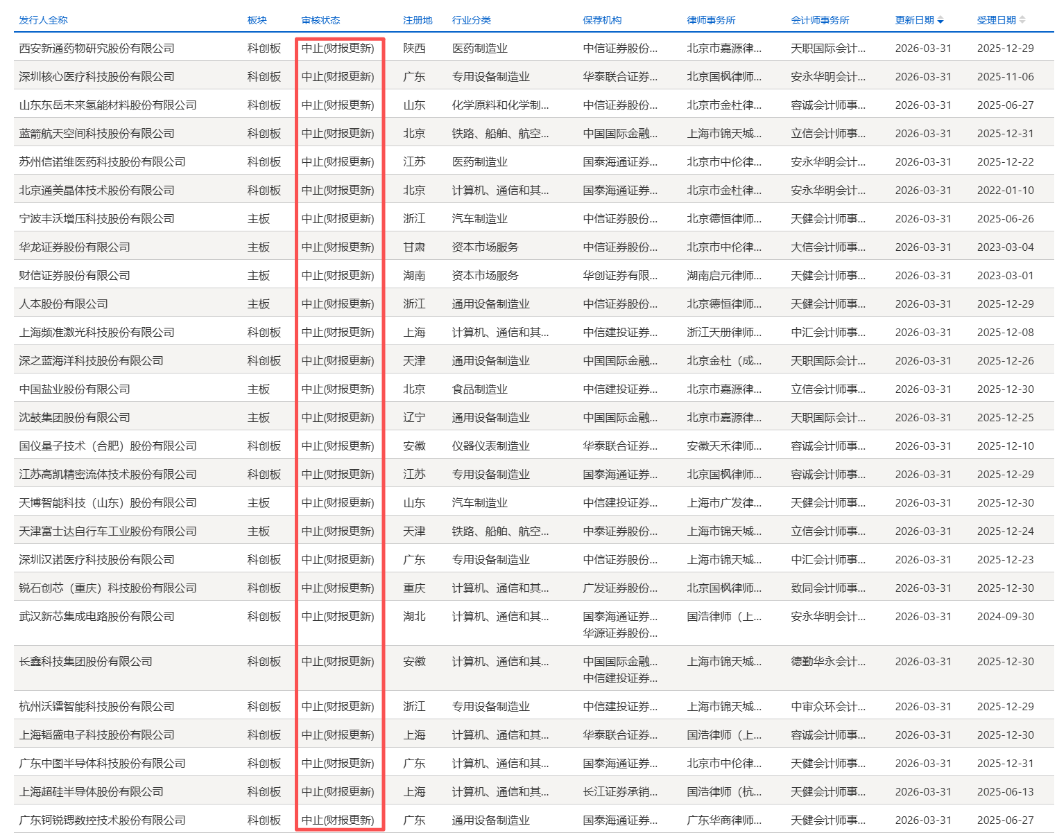 3月31日,据上交所官网,蓝箭航天空间科技股份有限公司(简称:蓝箭航天)、深圳汉诺医疗科技股份有限公司(简称:汉诺医疗)、锐石创芯(重庆)科技股份有限公司(简称:锐石创芯)、武汉新芯集成电路股份有限公司(简称:新芯股份)、长鑫科技集团股份有限公司(简称:长鑫科技)等在内的27家公司IPO中止,因发行上市申请文件中记载的财务资料已过有效期,需要补充提交。