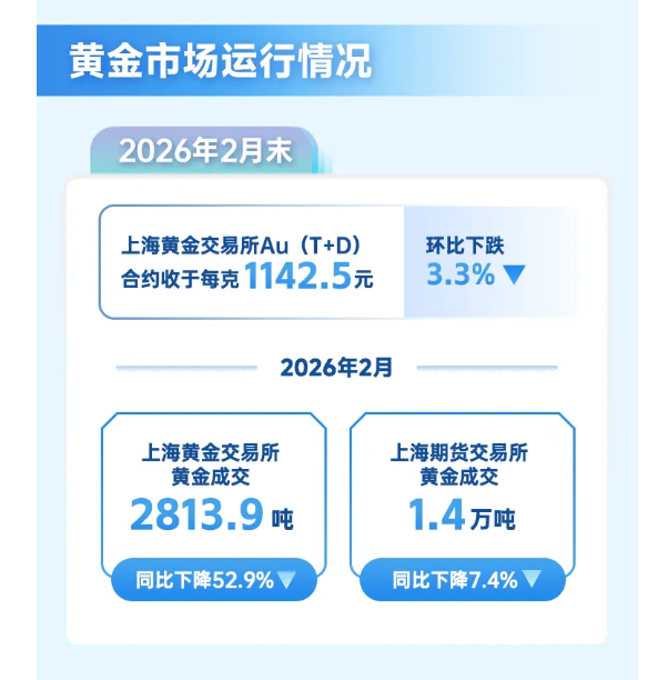 3月31日,央行发布2026年2月金融市场运行情况。2026年2月末,上海黄金交易所Au(T+D)合约收于每克1142.5元,环比下跌3.3%。2026年2月,上海黄金交易所黄金成交2813.9吨,同比下降52.9%;上海期货交易所黄金成交1.4万吨,同比下降7.4%。
