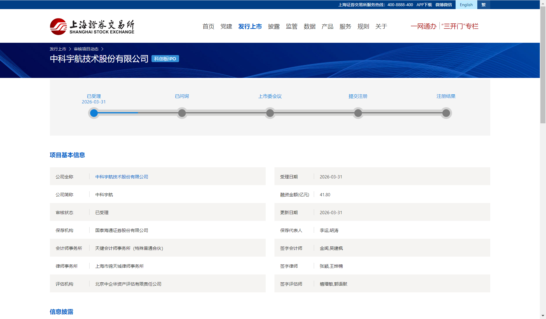 3月31日,中科宇航技术股份有限公司科创板IPO申请获受理。中科宇航此次IPO申报采用科创板第二套上市标准,此次募资重点用于低成本、可重复使用大型运载火箭和可重复使用运载器与航天器等产品的研制。