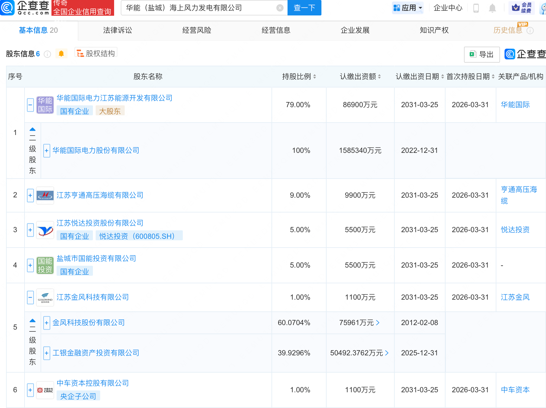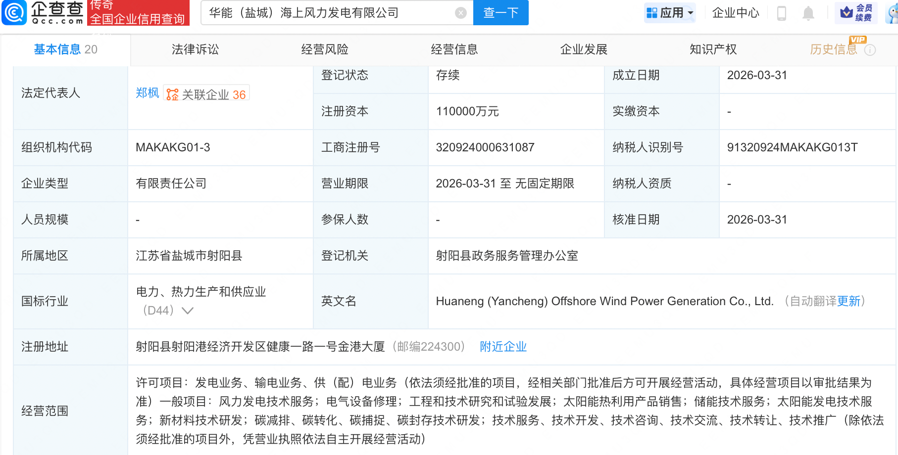 企查查APP显示,近日,华能(盐城)海上风力发电有限公司成立,注册资本11亿元,经营范围包含:太阳能热利用产品销售;储能技术服务;太阳能发电技术服务;新材料技术研发等。企查查股权穿透显示,该公司由华能国际(600011.SH)全资子公司华能国际电力江苏能源开发有限公司、悦达投资(600805)等共同持股。