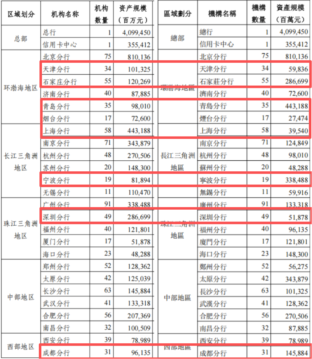 相应在H股年报中,天津分行、石家庄分行、青岛分行、烟台分行、上海分行、宁波分行、深圳分行、成都分行资产规模却分别为598.36亿元、2866.99亿元、4431.88亿元、274.74亿元、395.4亿元、3384.88亿元、518.78亿元、1458.84亿元。