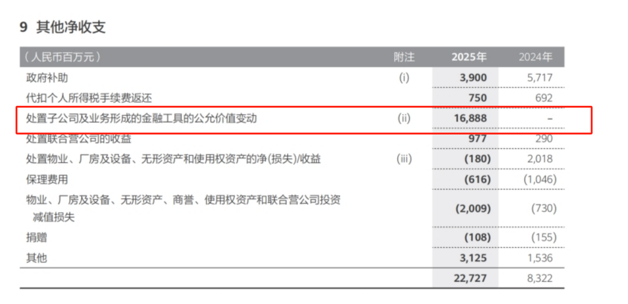 营业利润大涨的另一重要原因是,华为处置子公司及业务形成的金融工具的公允价值变动。这部分增加了168.88亿元的收入,而这个收入在2024年则为零。