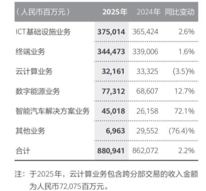 从业务结构来看,两大基本盘——ICT基础设施和终端业务——均仅实现不到3%的微增;增速最快的智能汽车解决方案业务,增幅也从2024年的474.4%大幅回落至72.1%。