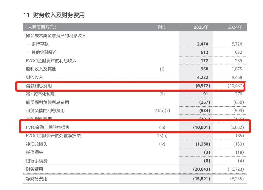 其中,FVPL金融工具(以公允价值计量且其变动计入当期损益的金融资产或金融负债)的净损失达108.01亿元。借款利息花了69.72亿元。