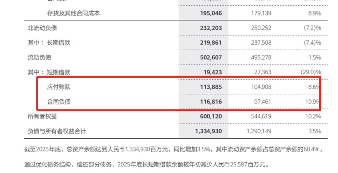 主要体现为合同负债增加,应付账款增加,两者是现金流增长的主要驱动力。年报显示,合同负债相较2024年提升19.99%,应付账款同比增长8.69%。