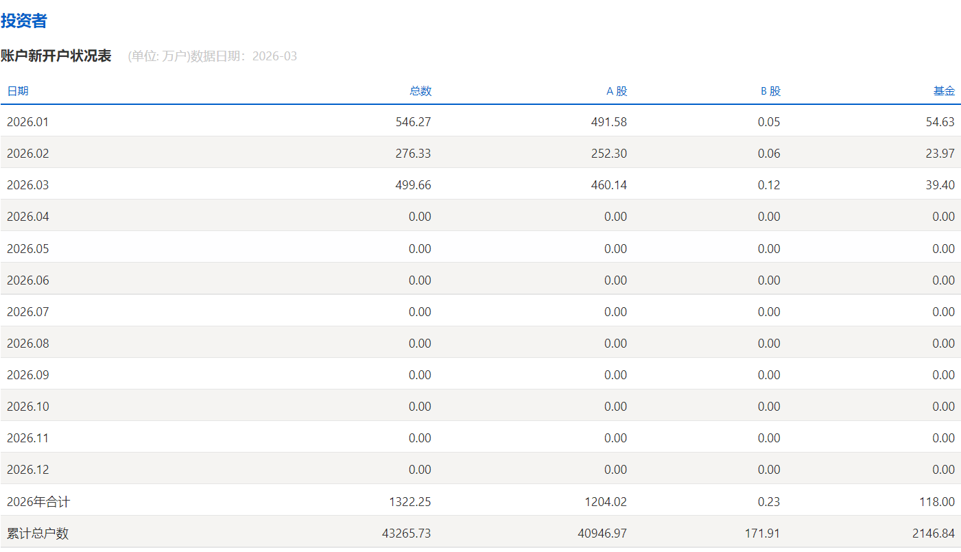 4月2日,上交所数据显示,2026年3月A股新开户460.14万户,环比增长82.38%,同比2025年3月的306.55万户增长50.10%。2026年累计新开1204.02万户,同比增长61.15%。