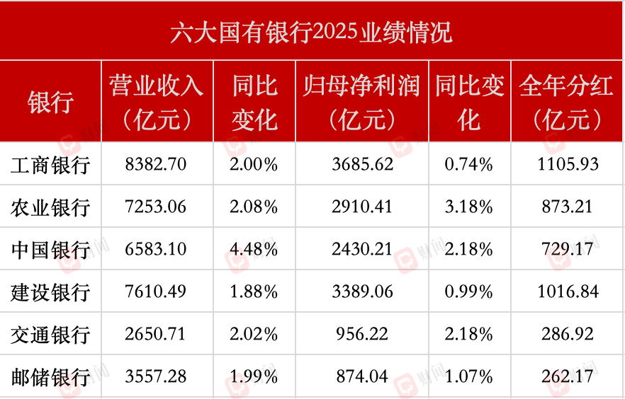 2025年,工商银行(601398.SH)、农业银行(601288.SH)、中国银行(601988.SH)、建设银行(601939.SH)、交通银行(601328.SH)、邮储银行(601658.SH)六大银行(简称“六大行”)合计实现归母净利润1.4万亿元,共分红超4200亿元,工商银行、建设银行全年分红均超过千亿元。