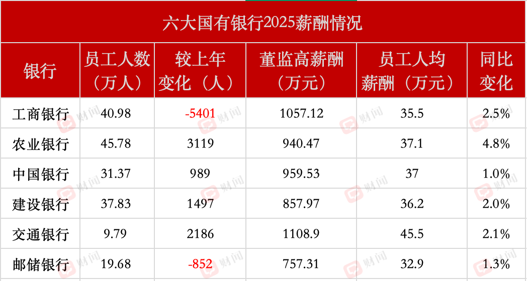 人员结构方面,2025年,工商银行和邮储银行较上年有所减少,其中工商银行减少超5000人。其他四家银行的员工数量都有所增加,其中农业银行增加超3000人,另外,交通银行、建设银行员工人数分别增超2000人、1000人。
