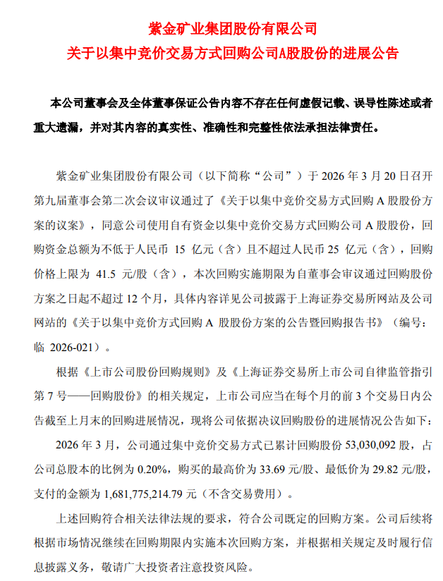4月2日,紫金矿业(601899.SH)公告称,公司发布关于以集中竞价交易方式回购A股股份的进展公告。2026年3月,公司通过集中竞价交易方式已累计回购股份5303.01万股,占公司总股本比例为0.20%。期间购买最高价为33.69元/股,最低价为29.82元/股,累计支付金额为16.82亿元(不含交易费用)。本次回购符合相关法律法规及既定方案要求,公司将根据市场情况在回购期限内继续实施。