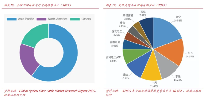 中国是全球最大、产业链最完整的光纤光缆生产国,2025 年中国光纤出货量达3.72亿芯公里,同比增长7.5%,占全球总出货量的 56.3%,全球供应链主导地位持续强化。