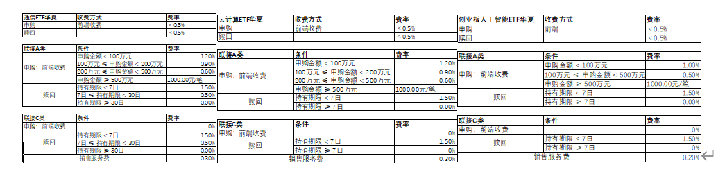注:以上所提及ETF均不收取申购费、赎回费、销售服务费,申购赎回代理机构可按照不超过0.5%的标准收取佣金,其中包含证券交易所、登记结算机构等收取的相关费用;此外,相关ETF及联接的管理费率和托管费率如下所示: