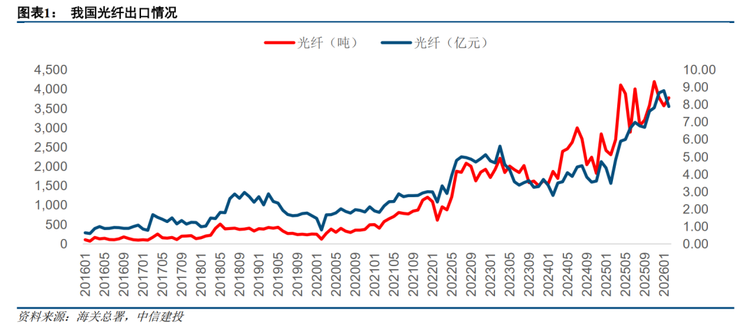 出口端更是呈现 “爆单” 态势,海外市场正在抢购中国光纤。海关数据显示,2026年2月我国出口光纤3779.9吨、出口金额 7.9 亿元,同比分别增长 63.6%、126.8%;折算为公里数,2 月单月我国出口光纤约2520万芯公里,占国内光纤月有效产量的65%左右,如果叠加光缆出口中隐含的光纤用量,实际出口占比将更高。