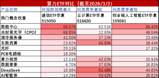 数据来源:iFinD、券商研报,华夏基金等,以上个股不作为推介,截至2026.3.2,个股不作为推荐。文中提及产品风险等级为R4(中高风险),以上均属于股票基金,风险与收益高于混合基金、债券基金与货币市场基金。投资者在投资基金之前,请仔细阅读基金的《基金合同》、《招募说明书》和《产品资料概要》等基金法律文件,充分认识基金的风险收益特征和产品特性,并根据自身的投资目的、投资期限、投资经验、资产状况等因素充分考虑自身的风险承受能力,在了解产品情况及销售适当性意见的基础上,理性判断并谨慎做出投资决策,独立承担投资风险。指数表现不代表产品业绩,二级市场价格表现不代表净值业绩。 作为ETF基金,投资者投资于本基金面临跟踪误差控制未达约定目标、指数编制机构停止服务、成份券停牌等潜在风险、标的指数回报与股票市场平均回报偏离的风险、标的指数波动的风险、基金投资组合回报与标的指数回报偏离的风险、标的指数变更的风险、基金份额二级市场交易价格折溢价的风险、申购赎回清单差错风险、参考IOPV决策和IOPV计算错误的风险、退市风险、投资者申购赎回失败的风险、基金份额赎回对价的变现风险、衍生品投资风险等。 对于ETF联接基金,基金资产主要投资于目标ETF,在多数情况下将维持较高的目标ETF投资比例,基金净值可能会随目标ETF的净值波动而波动,目标ETF的相关风险可能直接或间接成为ETF联接基金的风险。ETF联接基金的特定风险还包括:跟踪偏离风险、与目标ETF业绩差异风险、指数编制机构停止服务风险、标的指数变更的风险、成份券停牌或违约的风险等。 本资料不作为任何法律文件,观点仅供参考,资料中的所有信息或所表达意见不构成投资、法律、会计或税务的最终操作建议,我公司不就资料中的内容对最终操作建议做出任何担保。在任何情况下,本公司不对任何人因使用本资料中的任何内容所引致的任何损失负任何责任。市场有风险,入市需谨慎。