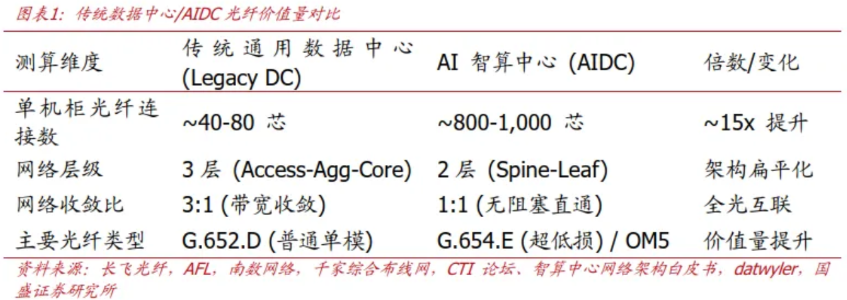 全球智算中心建设的爆发,已成为光通信需求爆发的核心引擎。与传统数据中心以CPU计算、存储和对外服务流量为主不同,AI智算中心需承载高密度GPU集群的协同计算,数千张GPU卡需在训练任务中实时、高频交换海量数据(如模型参数、梯度)。这导致其内部网络架构(如InfiniBand或RoCE以太网)极度复杂和密集,国盛证券测算,单机柜的光纤消耗量达到传统机房的5-10倍。
