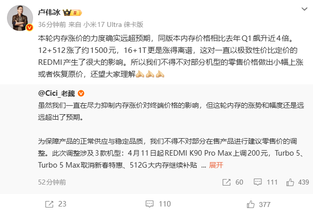 小米官宣涨价!卢伟冰回应:内存价格飙升近4倍,12+512成本暴涨1500元