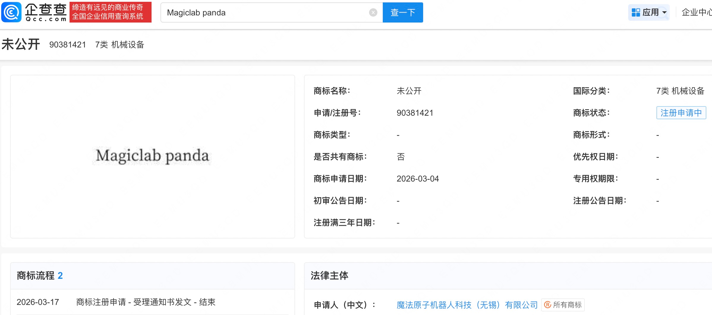 企查查APP显示,近日,魔法原子机器人科技(无锡)有限公司申请注册“Magiclab panda”商标,国际分类为机械设备,当前商标状态为注册申请中。 公开资料显示,魔法原子曾在春晚推出机器熊猫“Magic Panda”。