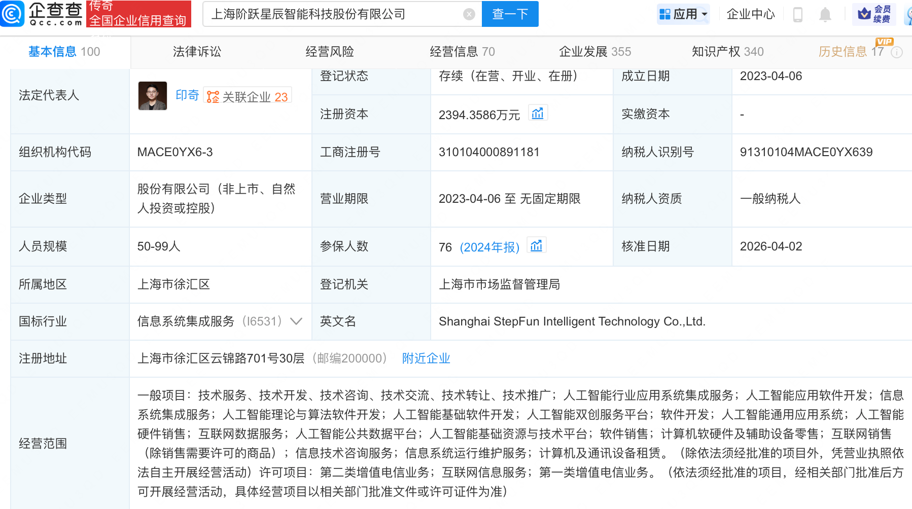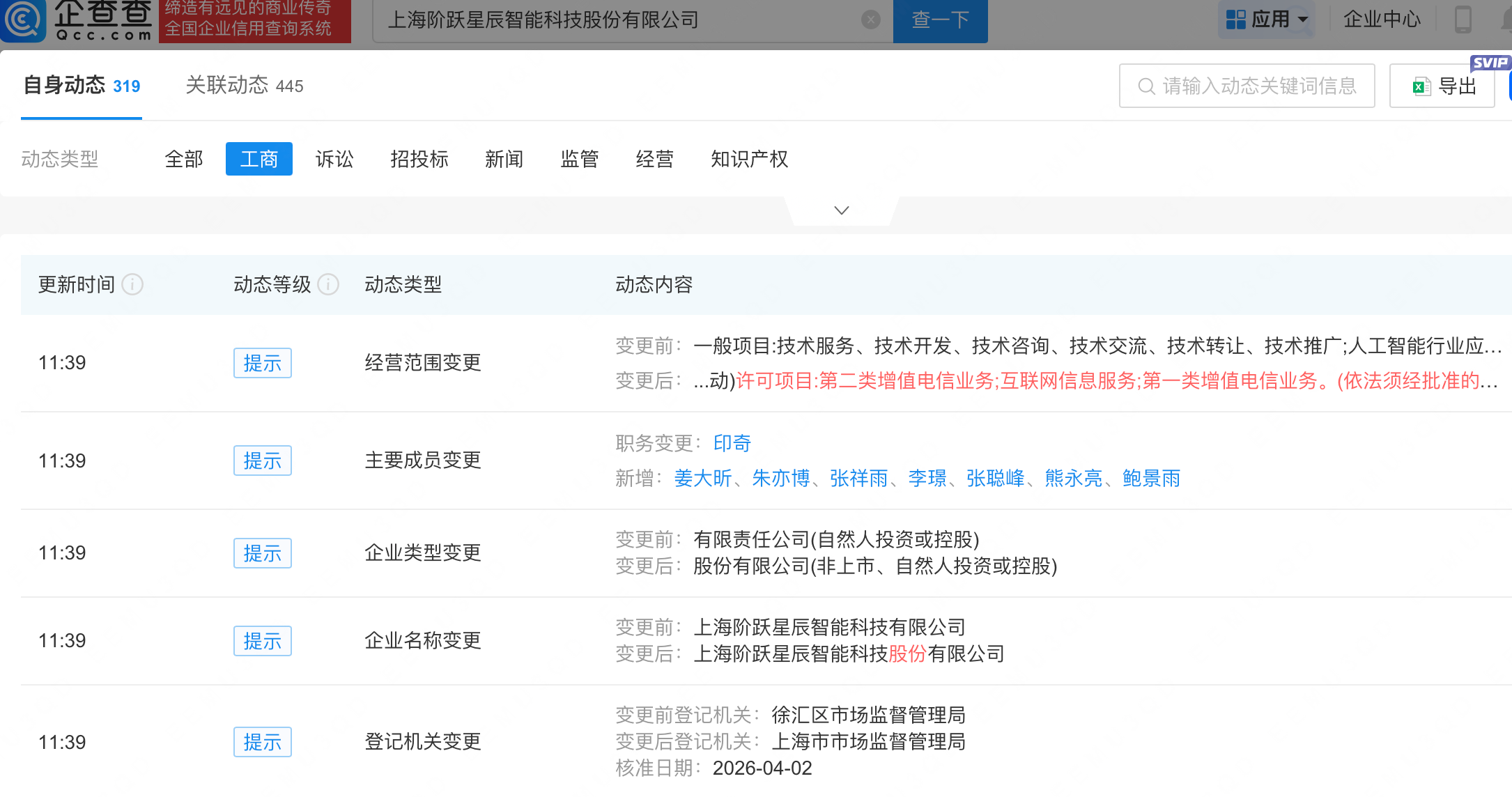 企查查APP显示,近日,上海阶跃星辰智能科技有限公司企业名称变更为上海阶跃星辰智能科技股份有限公司,企业类型变更为股份有限公司(非上市、自然人投资或控股)。企查查信息显示,该公司成立于2023年4月,法定代表人为印奇,经营范围包含:人工智能基础软件开发;人工智能双创服务平台;软件开发;人工智能通用应用系统等,由跃能齐鑫(上海)企业管理咨询有限公司等共同持股。公开信息显示,阶跃星辰(StepFun)是一家AI大模型公司。