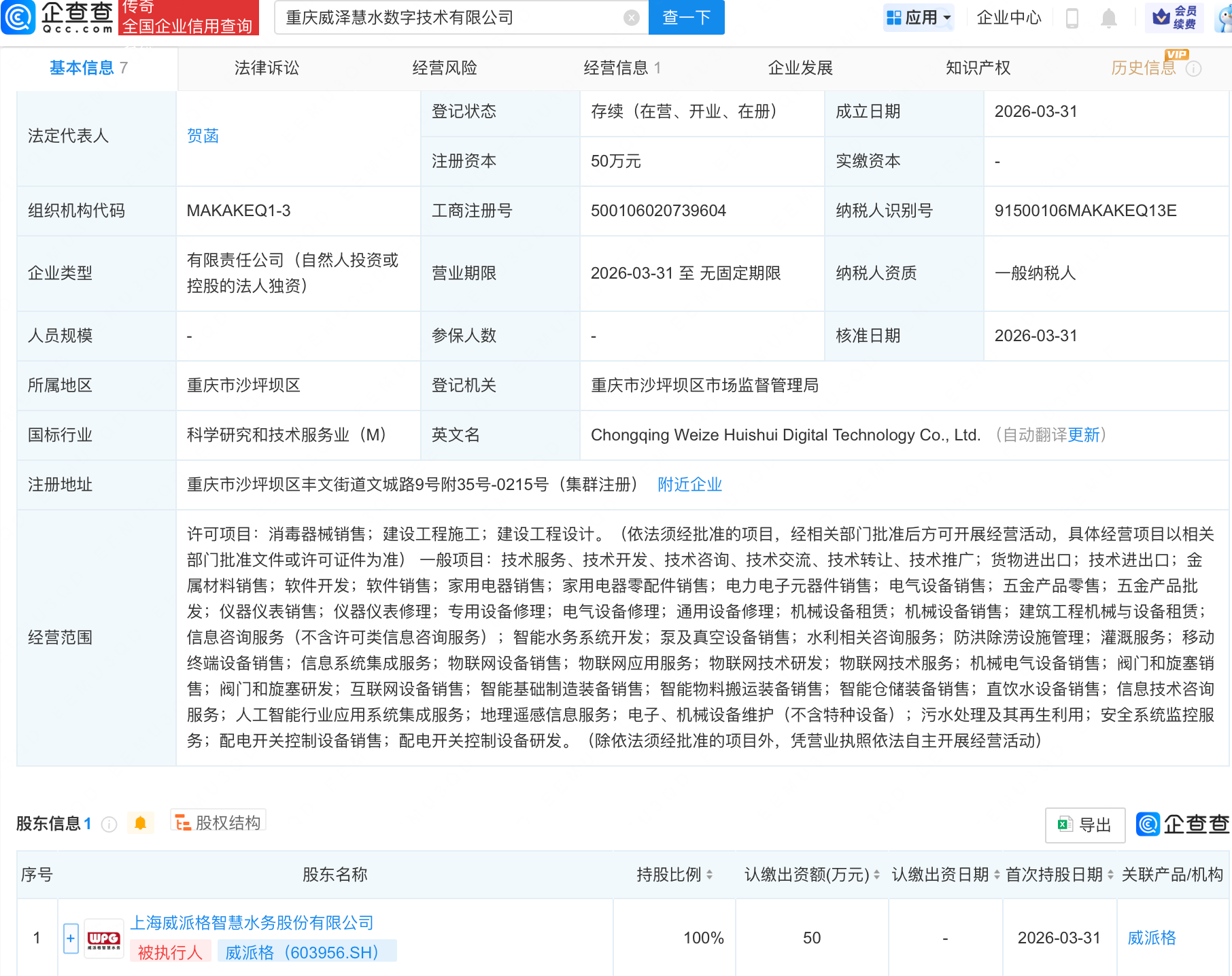 企查查APP显示,近日,重庆威泽慧水数字技术有限公司成立,经营范围包含:物联网设备销售;物联网应用服务;物联网技术研发;人工智能行业应用系统集成服务;地理遥感信息服务等。企查查股权穿透显示,该公司由威派格(603956.SH)全资持股。