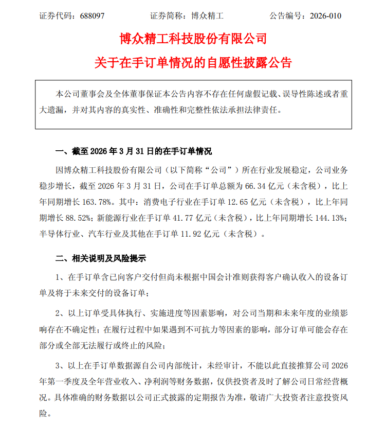 4月3日,博众精工(688097.SH)公告称,截至2026年3月31日,公司在手订单总额为66.34亿元,比上年同期增长163.78%。其中:消费电子行业在手订单12.65亿元,比上年同期增长88.52%;新能源行业在手订单41.77亿元,比上年同期增长144.13%;半导体行业、汽车行业及其他在手订单11.92亿元。