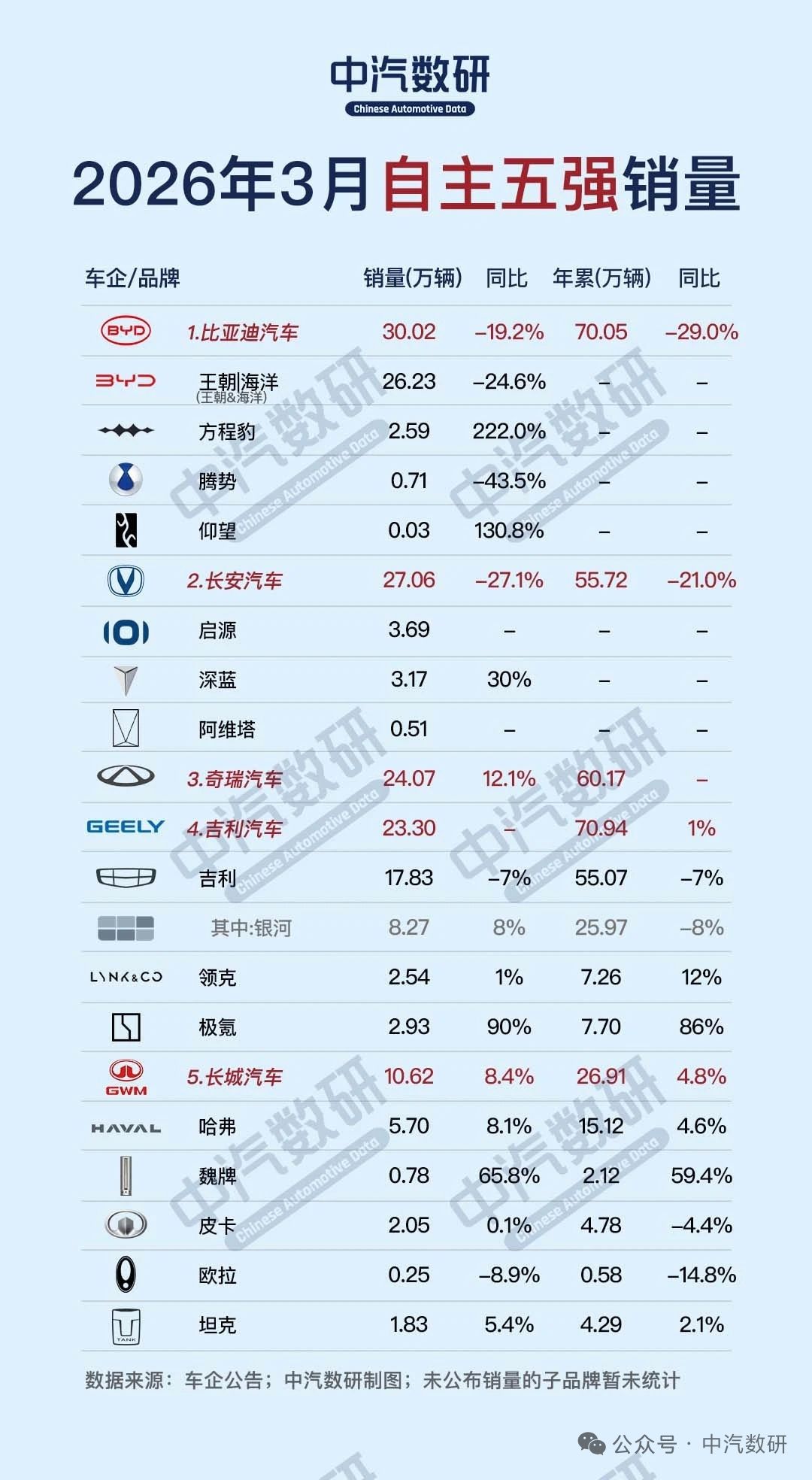 具体来看,比亚迪(002594.SZ)、长安汽车(000625.SZ)3月销量同比下降。3月,比亚迪销量为30.02万辆,同比减少19.2%,其中王朝&海洋系列、腾势品牌同比有所下滑,方程豹、仰望同比实现上升;长安汽车销量为27.06万辆,同比减少27.1%。