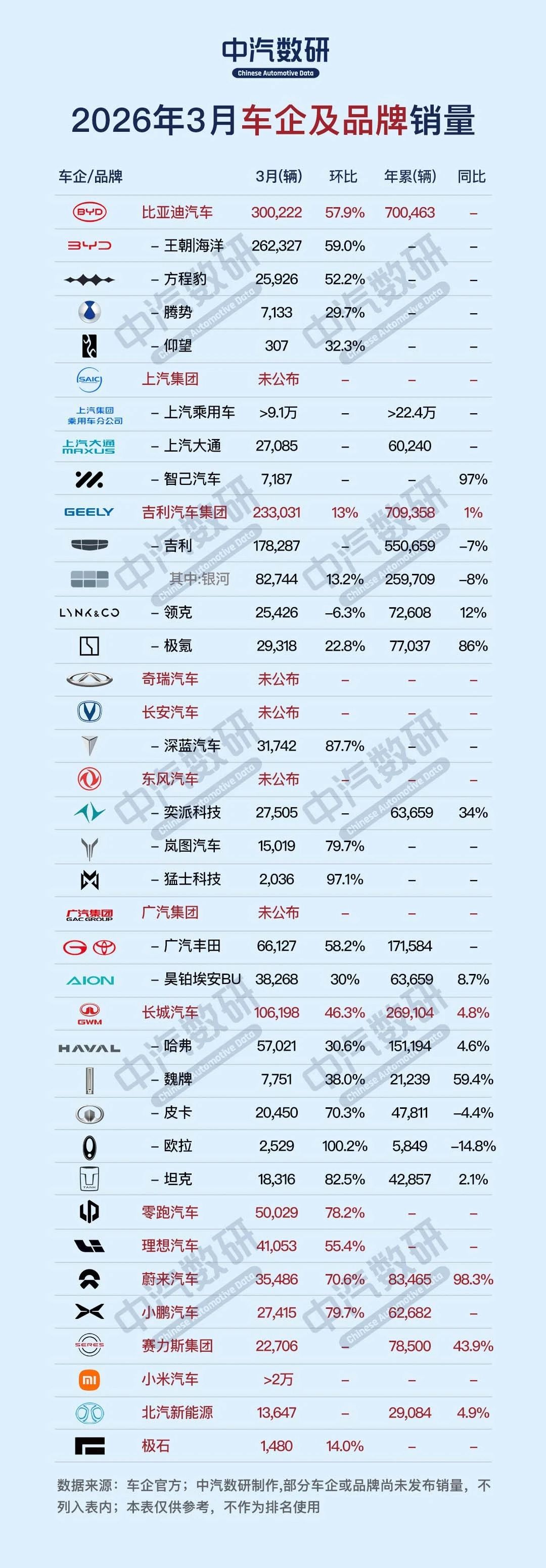 进入4月,各车企2026年3月及第一季度销量数据陆续揭晓。在经历了春节后的缓慢修复期后,3月下半旬起,随着各地以旧换新补贴政策发力和春季新车上市,车市热度逐步提升,呈现出明显的季节性回暖态势。