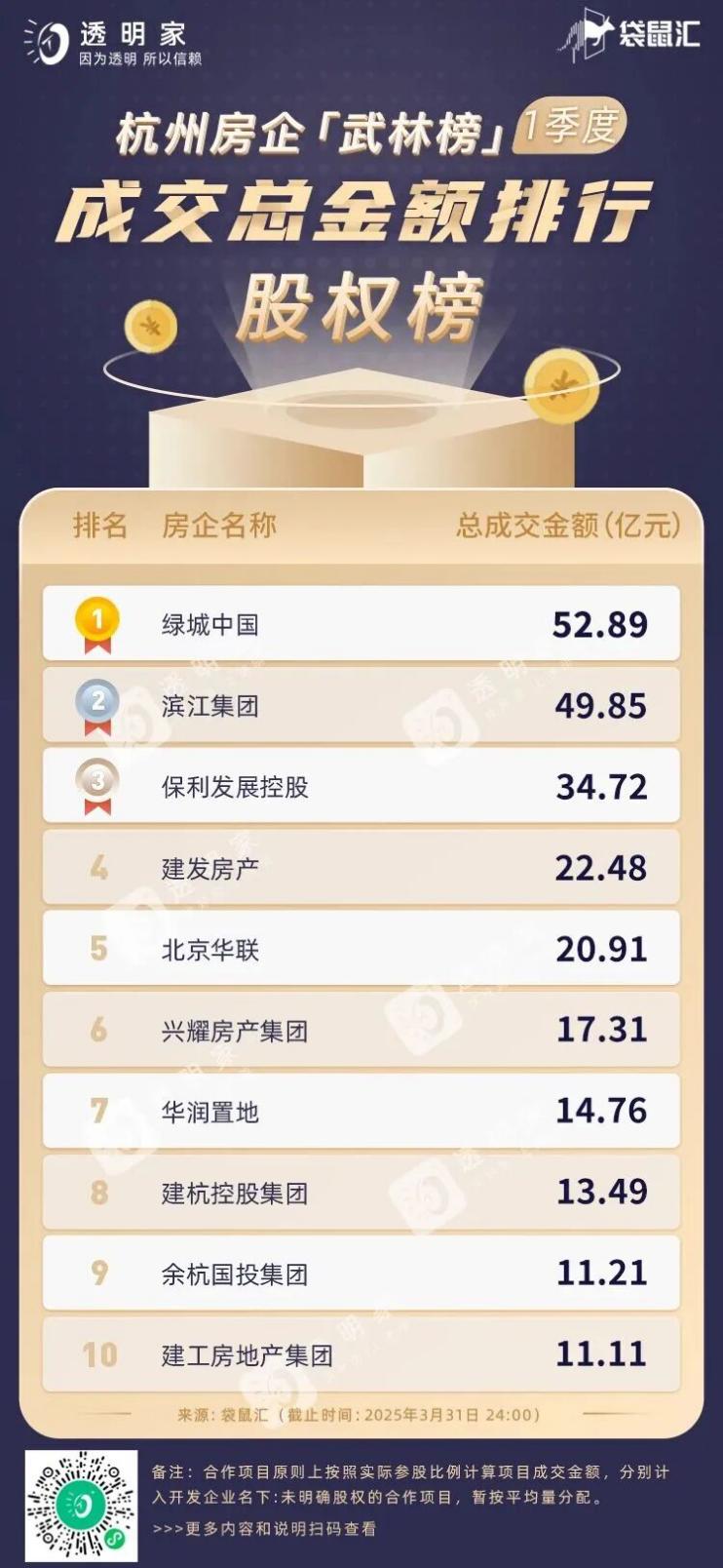在第三方平台近日发布的区域销售榜单中,一季度,绿城以52.89亿元的成交额位列杭州房企股权榜成交金额首位(数据来自透明家),同时收获了嘉兴的销售金额冠军(数据来自克而瑞)。