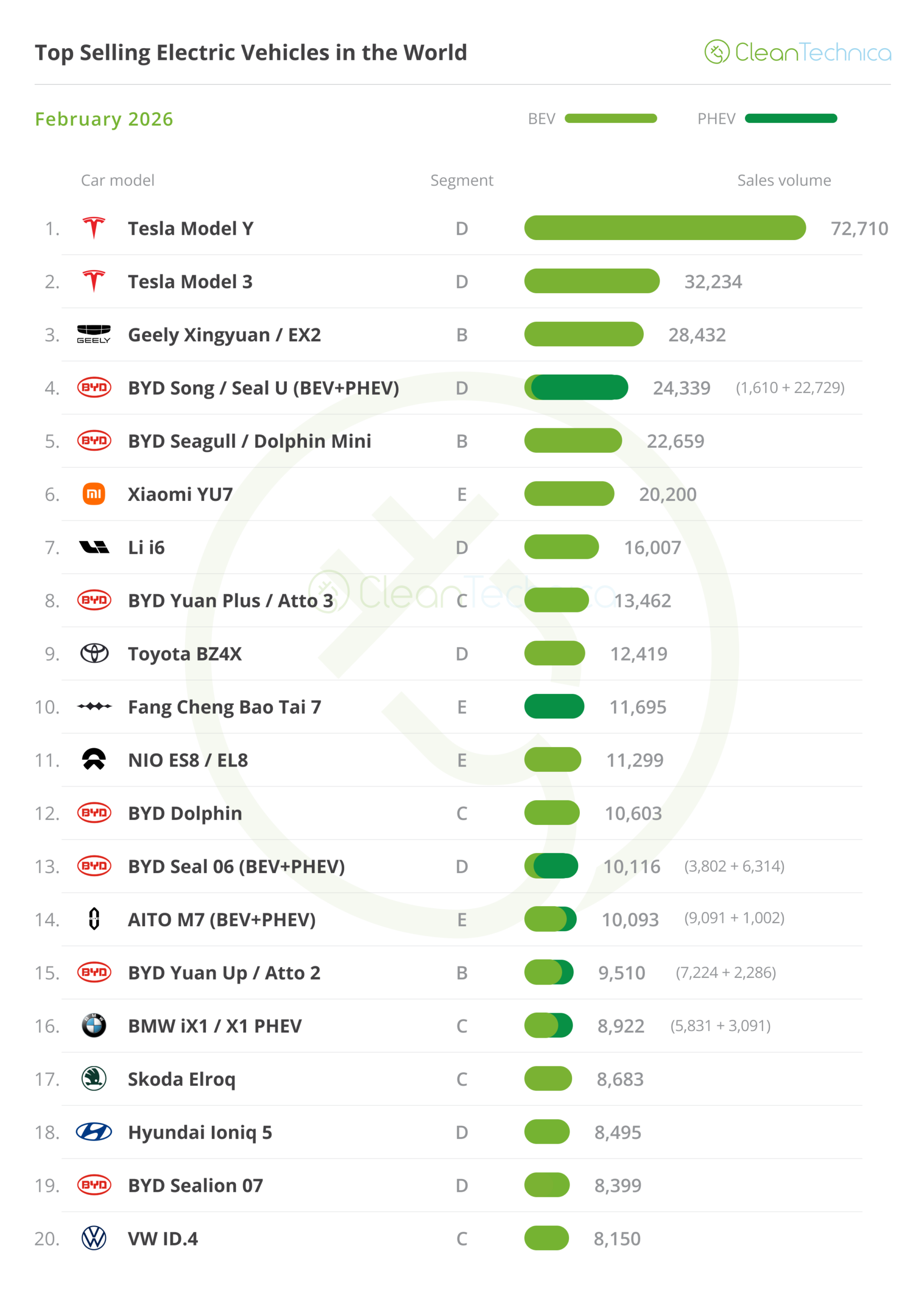 据cleantechnica报道,2026年2月,全球插电式电动汽车(PEV)注册量同比下降11%,达约110万辆,其中纯电动车(BEV)下降8%、插电混动(PHEV)下降16%,为疫情以来最大降幅,主因系美国去年10月及中国2025年底激励政策退出所致,二者分别为全球第三与第一大市场。