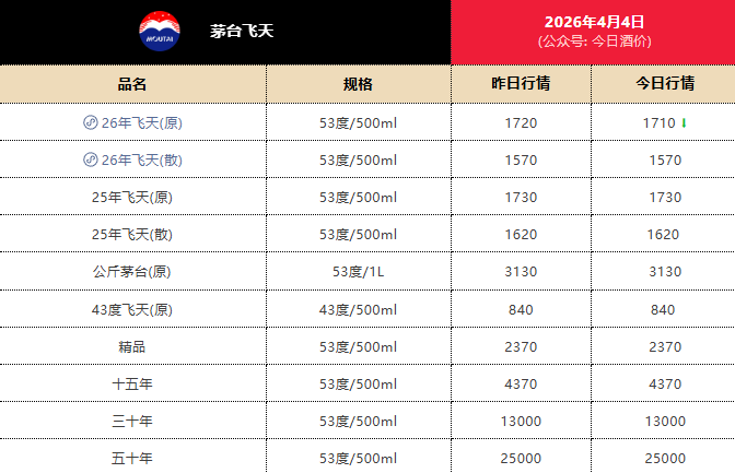 飞天茅台原箱每瓶下降10元/瓶,报1710元/瓶 财闻 2026-04-04 13:46:11 4月4日,飞天茅台原箱批发价下降10元/瓶,报1710元/瓶。 据今日酒价数据,4月4日,飞天茅台原箱批发价下降10元/瓶,报1710元/瓶。