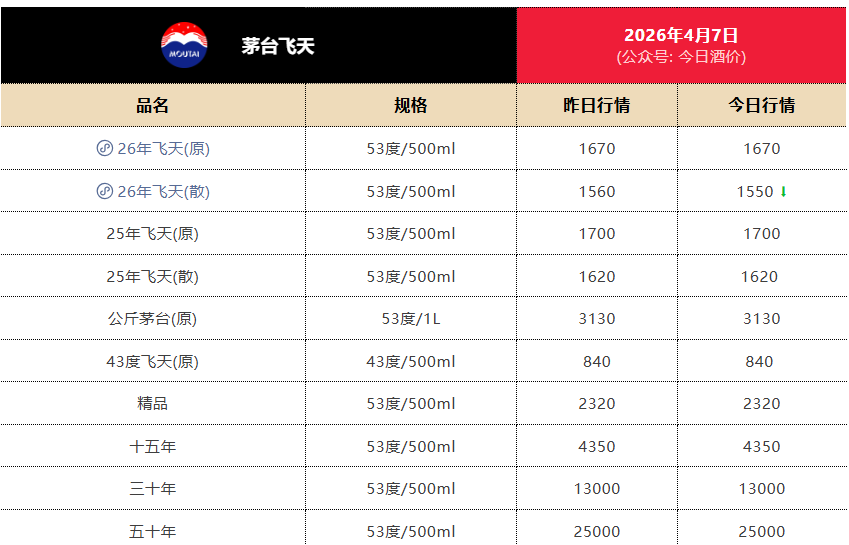 飞天茅台散装每瓶下降10元/瓶,报1550元/瓶 财闻 2026-04-07 10:19:24 4月7日,飞天茅台散装批发价下降10元/瓶,报1550元/瓶。 据今日酒价数据,4月7日,飞天茅台散装批发价下降10元/瓶,报1550元/瓶。