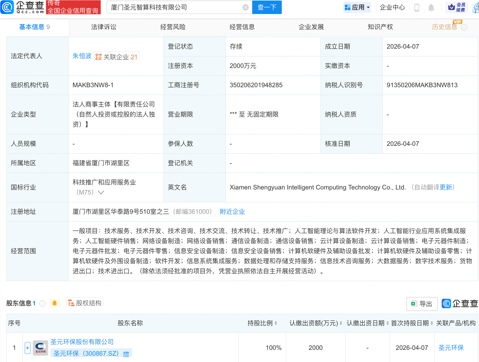 企查查APP显示,近日,厦门圣元智算科技有限公司成立,注册资本2000万元,经营范围包含:人工智能理论与算法软件开发;人工智能行业应用系统集成服务;人工智能硬件销售等。企查查股权穿透显示,该公司由圣元环保(300867.SZ)全资持股。