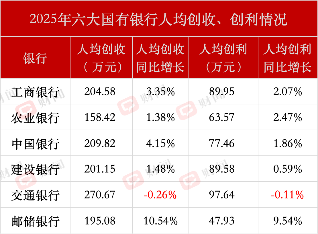 相比之下,6家国有大行则呈现出不同态势:2025年人均薪酬均实现小幅上涨;在人均创收与人均创利方面,除交通银行(601328.SH)外,其余5家均保持增长,整体表现相对稳健。