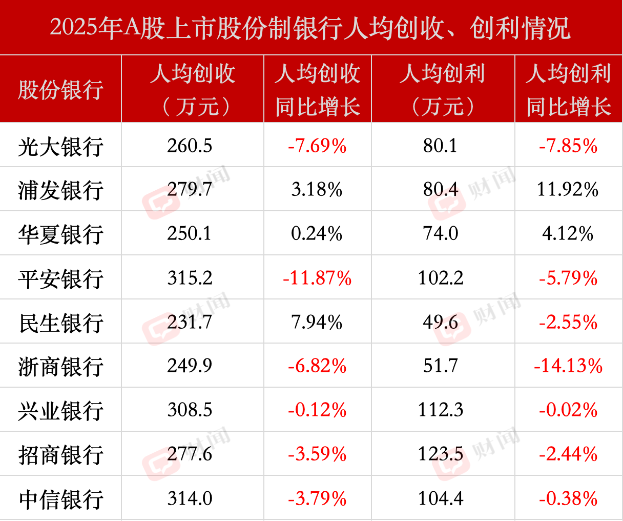 从行业整体来看,在A股上市的9家股份制银行中,共有6家出现人均薪酬下调,其中光大银行(601818.SH)人均降薪幅度超9万元;在人均经营指标方面,浦发银行(600000.SH)、华夏银行(600015.SH)人均创收与人均创利两个指标均实现同比正增长。