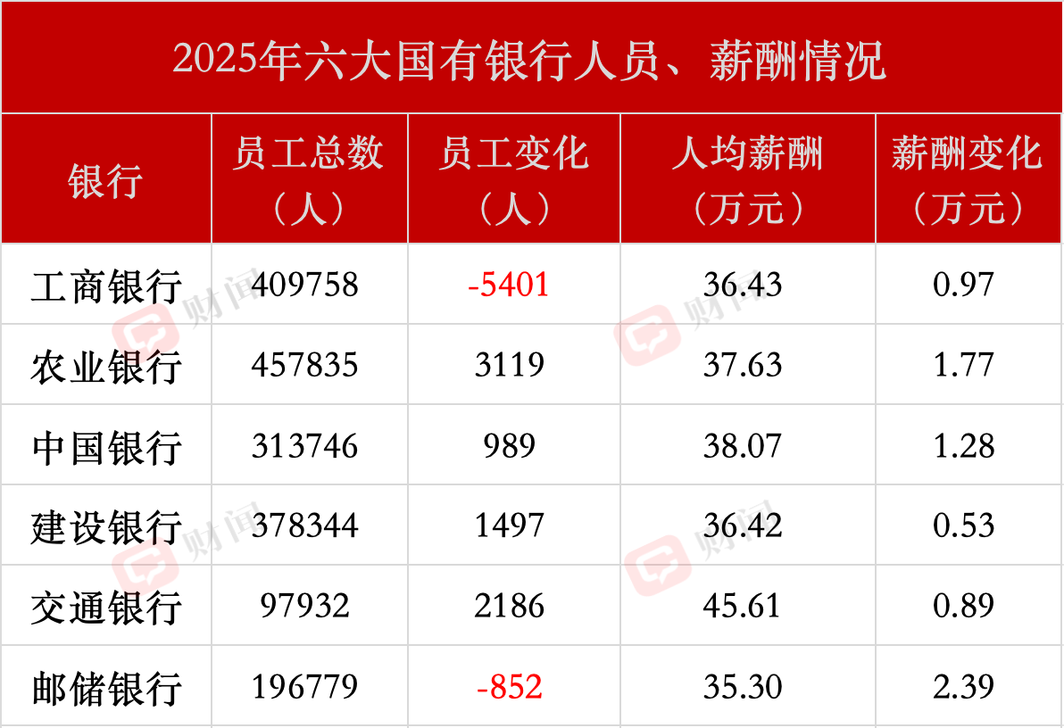 再看6家国有银行,员工数量方面,2025年,工商银行(601398.SH)和邮储银行(601658.SH)较上年有所减少,其中工商银行减少超5000人;其余四家银行员工数量都有所增加,其中农业银行(601288.SH)增加超3000人,交通银行、建设银行(601939.SH)员工人数分别增加超2000人、1000人。