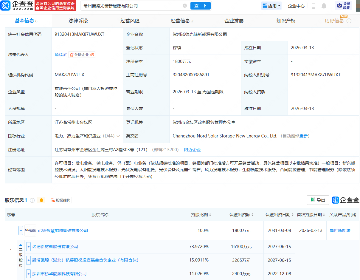 企查查APP显示,近日,常州诺德光储新能源有限公司成立,法定代表人为詹佳武,注册资本为1800万元,经营范围包含:发电业务、输电业务、供(配)电业务;太阳能发电技术服务;光伏发电设备租赁等。企查查股权穿透显示,该公司由诺德股份(600110.SH)旗下诺德智慧能源管理有限公司全资持股。