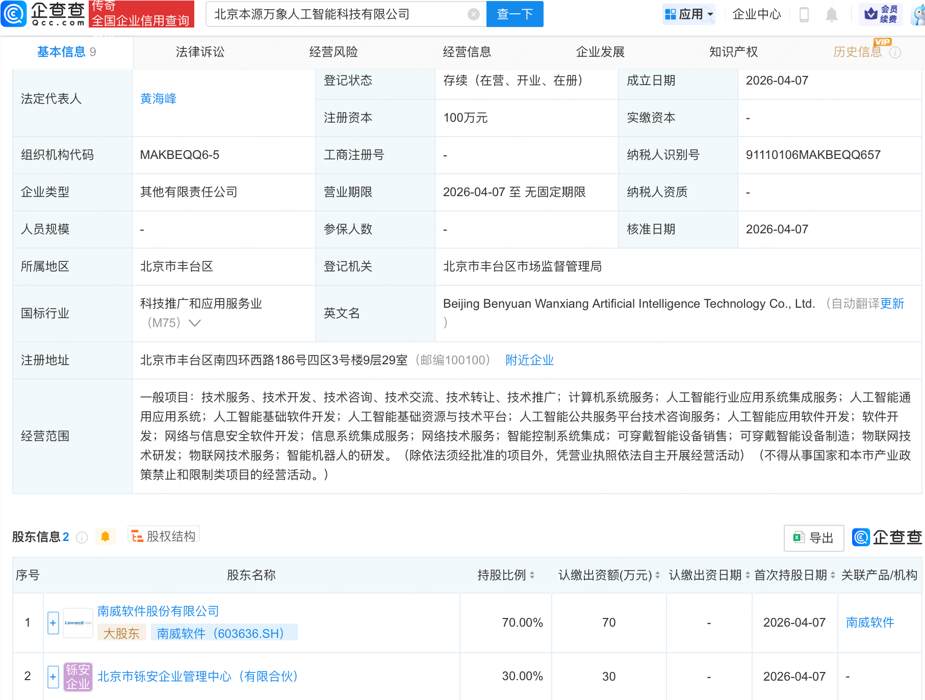 企查查APP显示,近日,北京本源万象人工智能科技有限公司成立,经营范围包含:人工智能行业应用系统集成服务;人工智能通用应用系统;人工智能基础软件开发;人工智能基础资源与技术平台等。企查查股权穿透显示,该公司由南威软件(603636.SH)等共同持股。